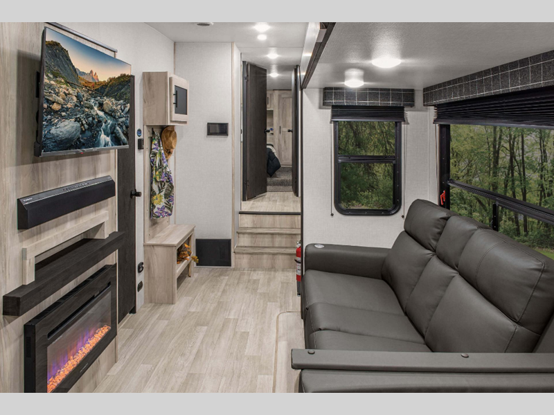 Sleeps 5 Slides 3 Length 34 ft 2 in Ext Width 8 ft Ext Height 12 ft 5 in Int Height 6 ft 3 in Interior Color Nomad Exterior Color Polar White Hitch Weight 1530 lbs GVWR 10000 lbs Dry Weight 8750 lbs Cargo Capacity 1250 lbs Fresh Water Capacity 45 gals Grey Water Capacity 50 gals Black Water Capacity 50 gals Tire Size 16" Furnace BTU 30000 btu Available Beds Queen Refrigerator Type Gas/Electric Refrigerator Size 8 cu ft Cooktop Burners 3 Number of Awnings 1 Axle Weight 7220 lbs LP Tank Capacity 30 lbs Water Heater Capacity 42000 gal Water Heater Type Tankless AC BTU 15000 btu TV Info LR LED TV Awning Info 13' Power with LED Light Strip Axle Count 2 Number of LP Tanks 2 Shower Type Radius Electrical Service 50 amp Similar Floorplans