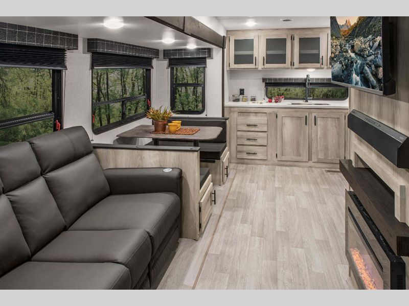 A key feature you will appreciate is the Climate package so you can camp anytime of the year. The one piece, seamless walk-on Tufflex roofing material will hold up through years of use. With a mandatory KZ Advantage package, you will get features like HDMI and USB charging, 36" storage bins in the booth dinette, seamless countertops that will be easy to clean, and an A/C RV airflow system to keep you cool even on the hottest summer day.
